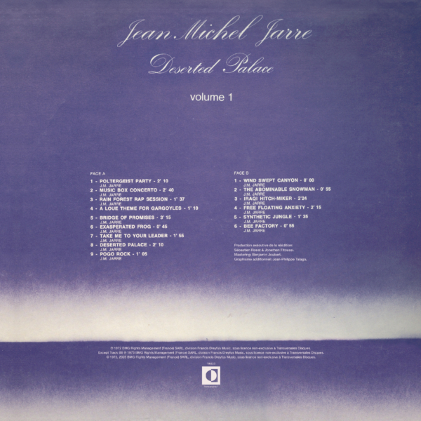Transversales Disques proudly presents the first official LP reissue of » Deserted Palace », studio album written & performed by Jean Michel Jarre in 1972, during his work experience at G.R.M. (Groupe de Recherches Musicales). In 1971, an order was placed with producer Francis Dreyfus to provide sound for public places such as airports and libraries. He decided to pass the project on to Jean-Michel, who had recently been signed by his record company.
