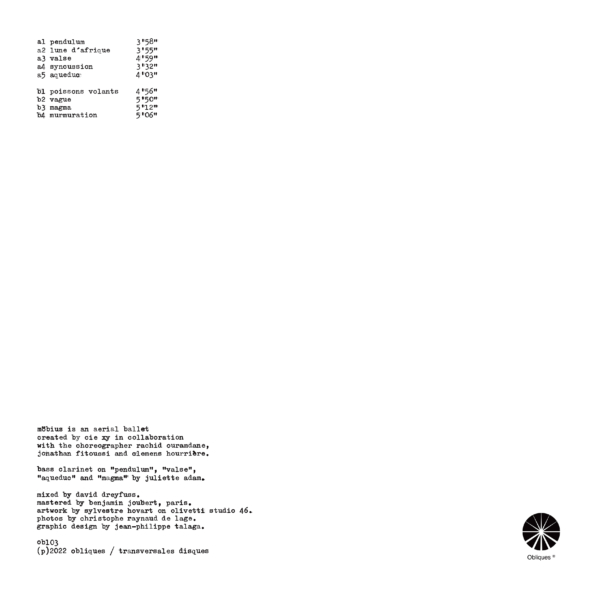 Bass clarinet on « Pendulum », « Valses », « Aqueduc », »Magma » by Juliette Adam.