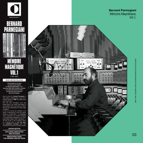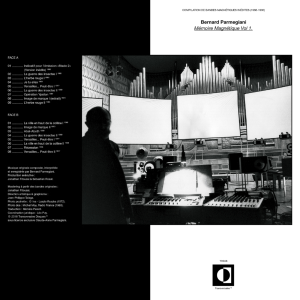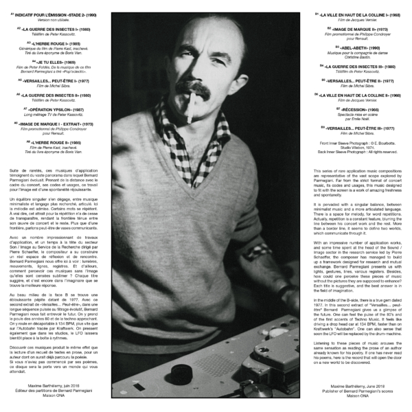 This series of rare application music compositions are representative of the vast scope explored by Parmegiani. Far from the strict format of concert music, its codes and usages, this music designed to fit with the screen is a work of amazing freshness and spontaneity. It is pervaded with a singular balance, between minimalist music and a more articulated language. There is a space for melody, for word repetitions. Actually, repetition is a constant feature, blurring the line between his concert work and the rest. More than a border line, it seems to define two worlds, which communicate through it. With an impressive number of application works, and some time spent at the head of the Sound / Image sector in the research service led by Pierre Schaeffer, the composer has managed to build up a framework designed for research and mutual exchange. Bernard Parmegiani presents us with lights, gestures, lines, various registers. Besides, how could one perceive these pieces of music without the pictures they are supposed to enhance? Each title is suggestive, and the best answer is in the field of imagination. In the middle of the B-side, there is a true gem dated 1977. In this second extract of “Versailles… peut-être“ Bernard Parmegiani gives us a glimpse of the future. One can feel the pulse of the 80’s and of the first accents of Techno Music. It feels like driving a drop head car at 134 BPM, faster than on Kraftwerk’s “Autobahn”. One can also sense that soon the LFO will be replaced by the drum-machine. Listening to these pieces of music arouses the same sensation as reading the prose of an author already known for his poetry. If one has never read his poems, here is the record that will open the door on a new world to be discovered / Maxime Barthélemy.