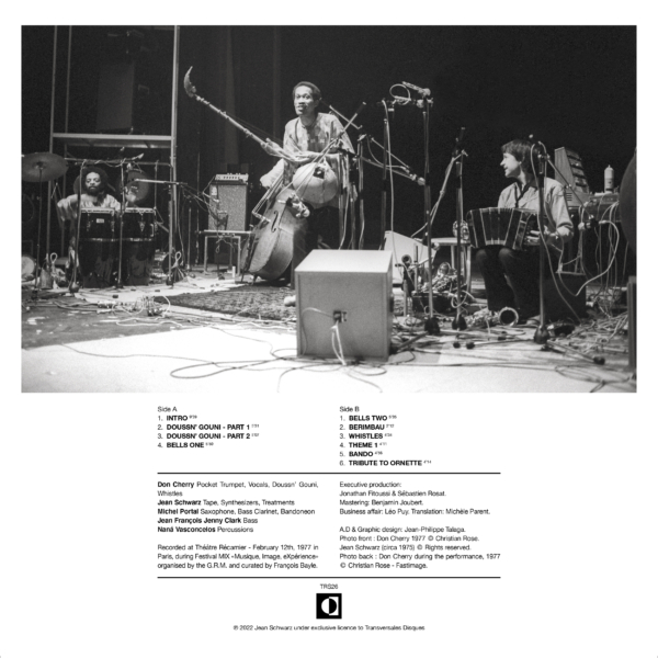 After more than 45 years forgotten in the personal archives of Jean Schwarz, Transversales Disques is very happy to release this previously unpublished recording which brings together the great Don Cherry and his friend, composer Jean Schwarz, pioneer in electro-acoustic music and member of G.R.M.